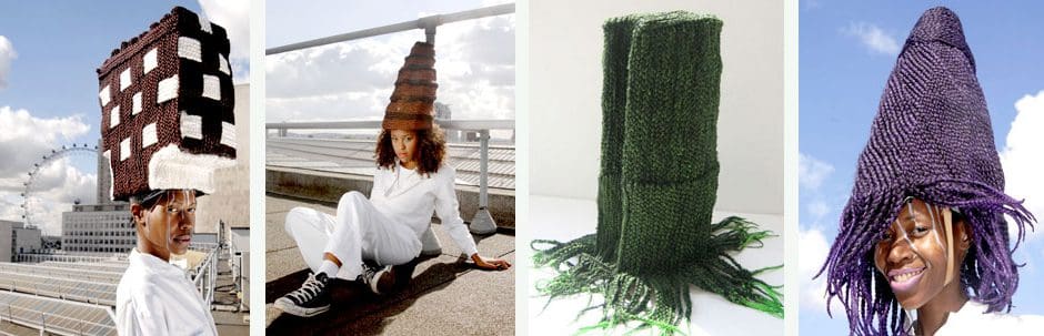 The skyscrapers in Tresses combine fantasies of Western “power of capital” with African inspired cultural practices of hair braiding suggesting the hidden connections between global economic operations and “third-world” manual labour. Nevertheless, the works have a celebratory feel which is amplified through their presentation as performances. Worn by people from wide range of ages and backgrounds, the fantasies of globalisation are re-focused onto the public, the individuals who shape as well as are being shaped by these images. Western culture as it manifests in cities like London, Paris and NYC is not a uniform expression of Anglo-Saxon history, but a composite of influences of people of broad ethnic and regional backgrounds.